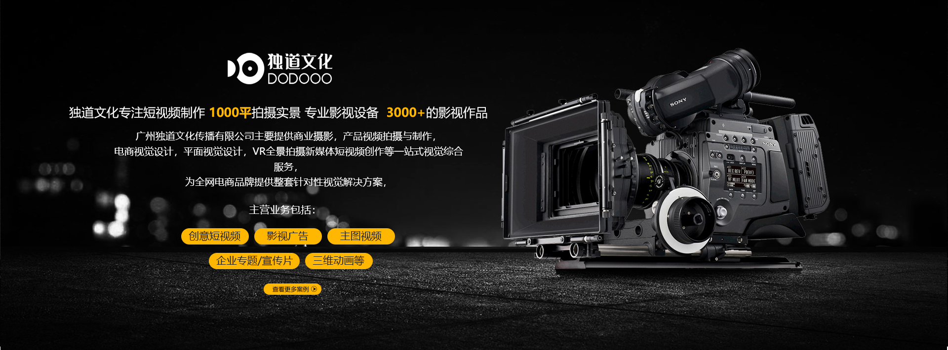 廣州獨(dú)道文化傳播有限公司主要提供商業(yè)攝影,產(chǎn)品視頻拍攝與制作,電商視覺設(shè)計(jì),平面視覺設(shè)計(jì),VR全景拍攝新媒體短視頻創(chuàng)作等一站式視覺綜合服務(wù),為全網(wǎng)電商品牌提供整套針對(duì)性視覺解決方案,